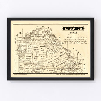 This vintage map makes for an ideal gift for history buffs and residents alike or as a sophisticated addition to your home or office decor. It's not only visually striking but also serves as an engaging conversation starter about Camp County's rich heritage in Texas history.
