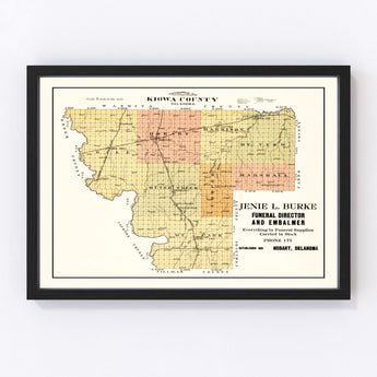 Discover a piece of history with our beautifully restored vintage map of Kiowa County, Oklahoma from 1913. This print is perfect for those who appreciate the rich tapestry of local history or love displaying unique decor at home or in the office. Whether you're familiar with cities like Hobart, Lone Wolf, or Snyder, this map makes an excellent conversation starter celebrating your favorite places.