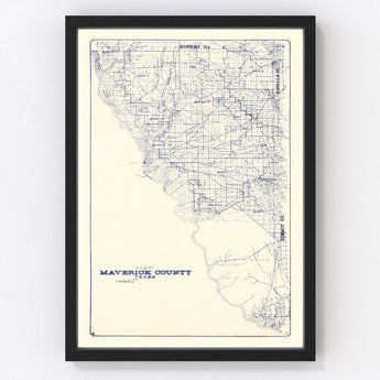 The print features significant locations within Maverick County and captures places like Eagle Pass and other notable towns. We've taken great care in crafting these maps by hand using high-quality materials—whether it's framed with stained solid wood or printed on durable polycotton canvas stretched over wooden bars. For those who prefer an unframed option, it comes printed on premium matte paper ready for framing at your convenience.