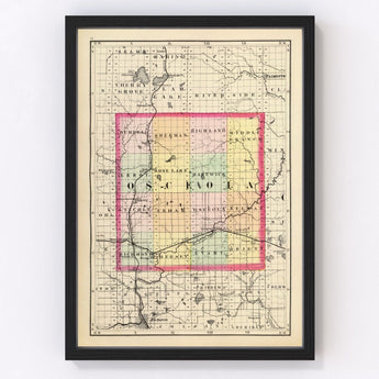 Discover a piece of local history with our beautifully restored 1873 map of Osceola County, Michigan. Whether it's the bustling areas like Reed City and Evart or the more tranquil corners of the county, this print brings the past to life with its intricate details and vintage charm. Perfect for history buffs, each map is printed on high-quality matte paper for unframed options or polycotton canvas stretched over solid wood bars for framed pieces.