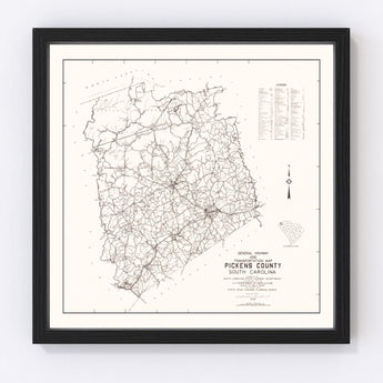 Discover the rich history of Pickens County, South Carolina, with this beautifully restored 1939 vintage map. Whether you're a history enthusiast or simply love unique decor, this map adds a touch of tradition and sophistication to any space. Each print is crafted with exceptional care—canvas prints are hand-stretched on solid wood bars and framed in stained solid wood, while unframed options boast high-quality matte paper. Featuring charming towns like Easley, Pickens, and Liberty within its borders, this map invites curiosity and conversation wherever you display it.