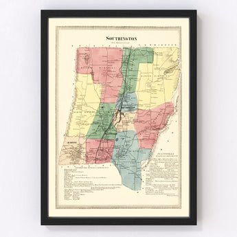 Discover a piece of history with this beautifully restored 1869 map of Southington, Connecticut. Located in the heart of Hartford County, this detailed piece captures the essence of a bygone era and is perfect for those who appreciate local history. Whether you're a resident or just have fond memories of the area, it's a delightful way to remember Southington's past.