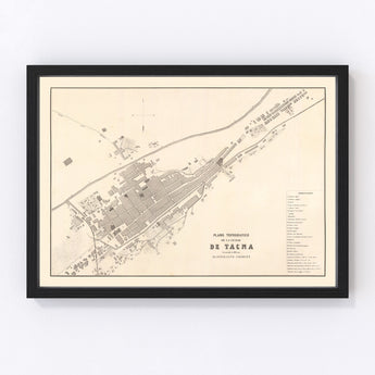 Discover a piece of history with our vintage 1865 map print of Tacna, Peru. Meticulously restored by Ted's Vintage Art, this charming map is more than just decor; it's a journey back in time. Perfect for history buffs and lovers of unique art alike, this print brings the rich past of Tacna to your home or office.